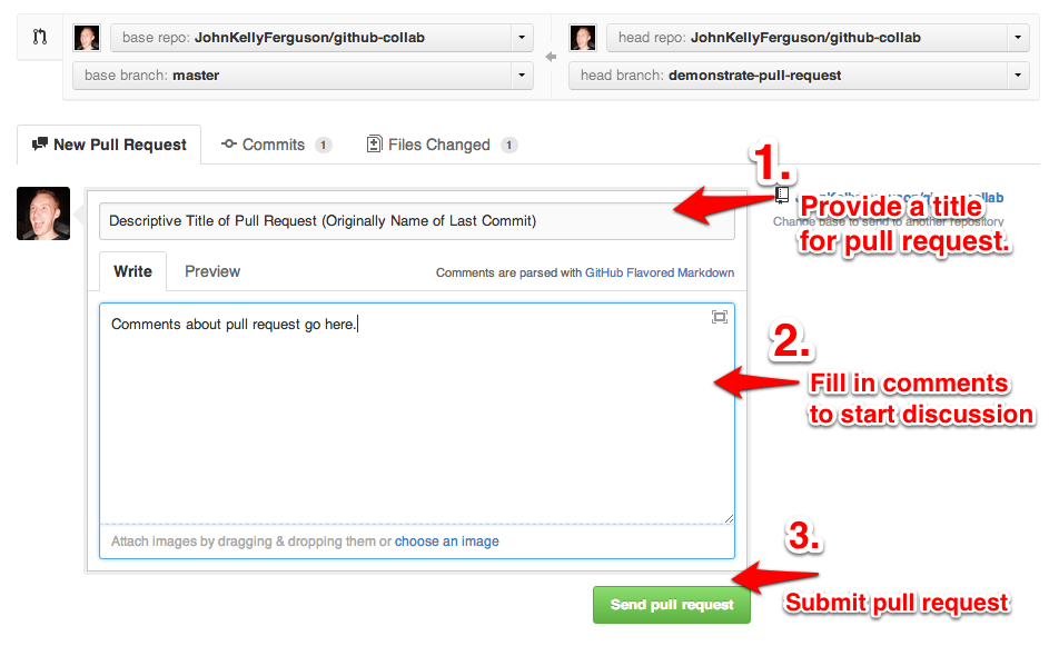 Enter in a title for the pull request, fill in some comments and submit it.